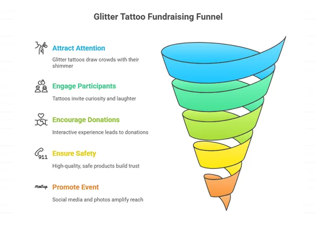 There’s also the practical side. Glitter tattoos are simple to manage, require minimal setup, and appeal to every age group. Kids love the sparkle, parents love how quick and mess-free it is, and adults often surprise themselves by joining in. It’s the kind of interactive experience that naturally attracts donations. That’s why we’ve seen so many schools, churches, and nonprofits adopt glitter tattoos as one of their go-to fundraising ideas.